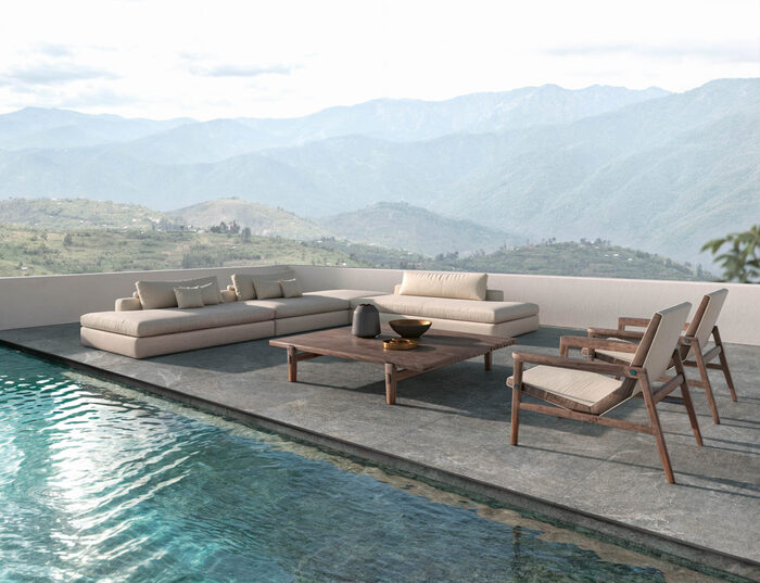 Feinsteinzeug in Steinoptik für den Außenbereich, erhältlich in vier verschiedenen warmen und einladenden Farbtönen, ideal zur Verkleidung jeder Art von Außenoberfläche. Darüber hinaus kann es mit dem entsprechenden Innenraumprodukt kombiniert werden.