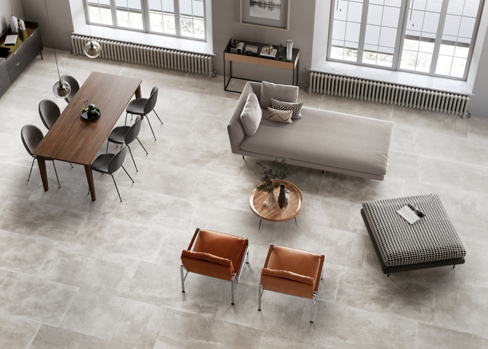 Feinsteinzeug in Steinoptik mit matter Oberfläche, das sich dank seines urbanen und modernen Stils perfekt für die Verlegung in Innenräumen aller Art eignet.
