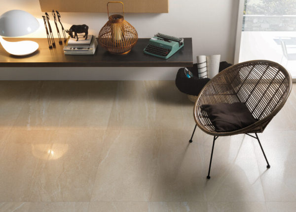 Mass-colored porcelain stoneware product with a stone effect, suitable for covering the different types of interior surfaces, from private homes to public spaces such as shops and restaurants.