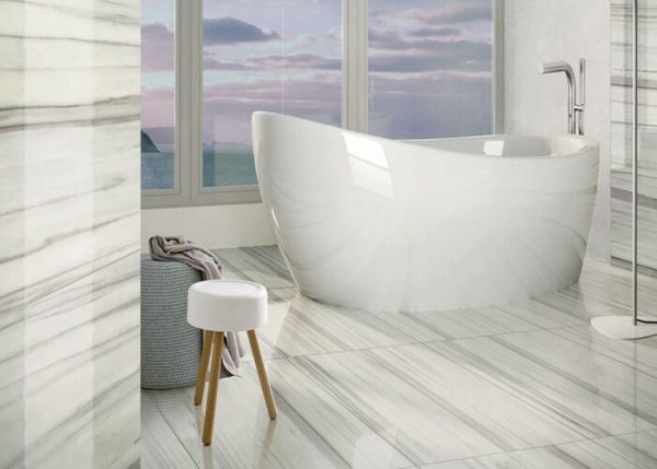 Marble Effect Porcelain Stoneware Tiles with both matt and glossy surface with an elegant and modern style, perfect for installation in any type of interior environment, from homes to restaurants and shops.