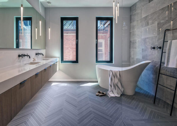 The new Mews coverings by Mutina recall the cosmopolitan atmosphere of London and its great variety of textures present in the infrastructures: bricks, wooden floors and irregular patterns of geometric shapes. The series comes in six basic neutral shades: Chalk, Fog, Pigeon, Lead, Ink and Soot, each of which is made up of 15 different tones. These tiles, in mass-coloured porcelain stoneware, can be found in various sizes: in the 11×11 square, in the 5.5×45 brick and in the 5.5×39.4 – 5.5×19.6 chevron, ideal for projects of contemporary and traditional.