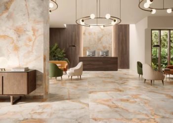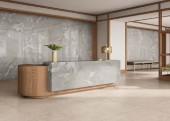 The Onici marble-effect porcelain stoneware collection refers to the beauty of quartz, the natural material that actually constitutes Onyx: a variation of tones that reinterprets the classic colors of marble, updating them in porcelain stoneware in a contemporary key. Between refined chromatic variations and sophisticated plays of light and shadow, Onici includes six different textures in natural and glossy finishes. Made of high-performance porcelain stoneware, the Onici collection is also available in large slabs perfect for enhancing the iridescent colors and typical nuances of natural stone. The glossy finish enhances the preciousness of the surface, increasing its shine and timeless elegance, while the excellent properties of porcelain stoneware make this material versatile, able to adapt to different environments and any style, from contemporary to classic, chic and refined.