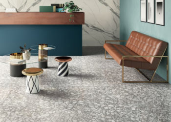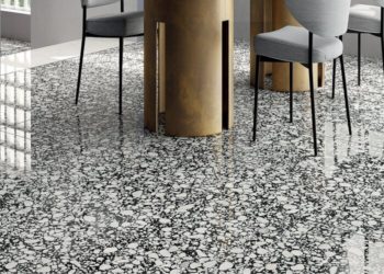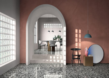 Inspired by Venetian terrazzo tiling, a great classic of Italian design, Shards features two different textures (Large and Small), in three shades in the format 120×120 cm, where fragments of stones, earthenware, and marble, mixed with cement and lime form a unique compound with an uneven appearance and variable textures. Its glossy surface increases in volume through the refraction of light, as it bounces off the different sized fragments of materials, creating stylish reflections that enhance design-led minimalist architecture with a sophisticated, timeless classicism.