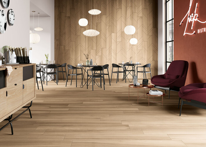Disponible dans des tons de bois classiques, le grès cérame effet bois Afmosia permet une perception intime et linéaire des environnements, tant résidentiels que commerciaux, grâce à son aspect très rayé et doux. Afromosia se combine bien avec d’autres matériaux, comme la pierre et le marbre, et s’adapte à un mobilier moderne avec quelques références au style nordique dans son sens plus doux et moins froid.