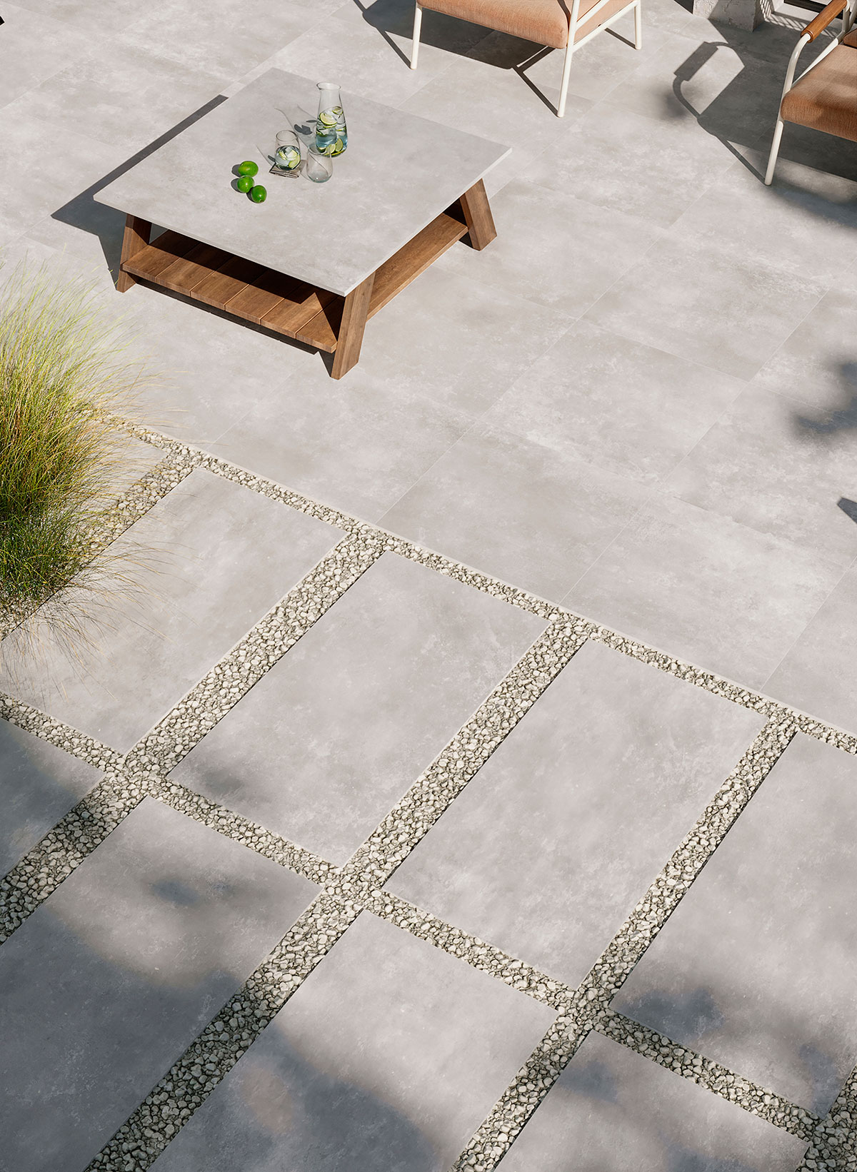 Grès cérame à effet cement avec une texture imparfaite et naturelle, adapté au pavage de tout type de surface extérieure, grâce à sa résistance due à son épaisseur de 20 mm. Possibilité de le combiner avec le produit d’intérieur correspondant.