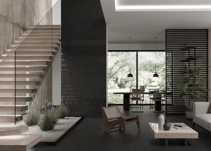 Piastrelle per pavimenti e rivestimenti in gres porcellanato tutta massa effetto pietra, prodotte da ARIOSTEA.