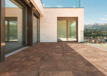 Pavimenti per esterni in gres porcellanato effetto cemento colorato in massa, spessorato e antiscivolo.